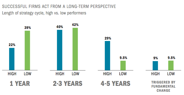 The CSOs are in agreement that time pressure is growing and uncertainty continues unabated. That means it’s a good time for strategy – but is it a good time for CSOs too? Chief strategists have always had to be two things at once: able to take fast and decisive action while being thoughtful and aware of the risks. What is particularly important today, however, becomes clear when we compare high-performing with low-performing firms. Successful firms make bold strategic decisions from a long-term perspective. Speed is important, but is not the be-all and end-all. Most CSOs, especially those in successful firms, say that they act (and react) faster than the competition. But three out of four firms take at least three months over their most important strategic decisions. Financial services companies are above-average in terms of the speed of their decision making, while firms in the life sciences and services industry and in the consensus-oriented Nordic countries weigh up strategic decisions particularly carefully. Surprisingly, high-performing firms take longer on average to make decisions than less successful firms. Despite increasing time pressure, high performers are not so much faster when it comes to implementation as more comprehensive. Typically, a strategy cycle lasts two to three years – rather less in the industrial sector and for retailers, and rather more in the financial sector and life sciences. Low performers are more than twice as likely to have strategy cycles of less than a year – a further indication that taking a perspective of longer than a year pays off. Clearly, today’s CSOs find speed important but the avoid taking action for action’s sake.